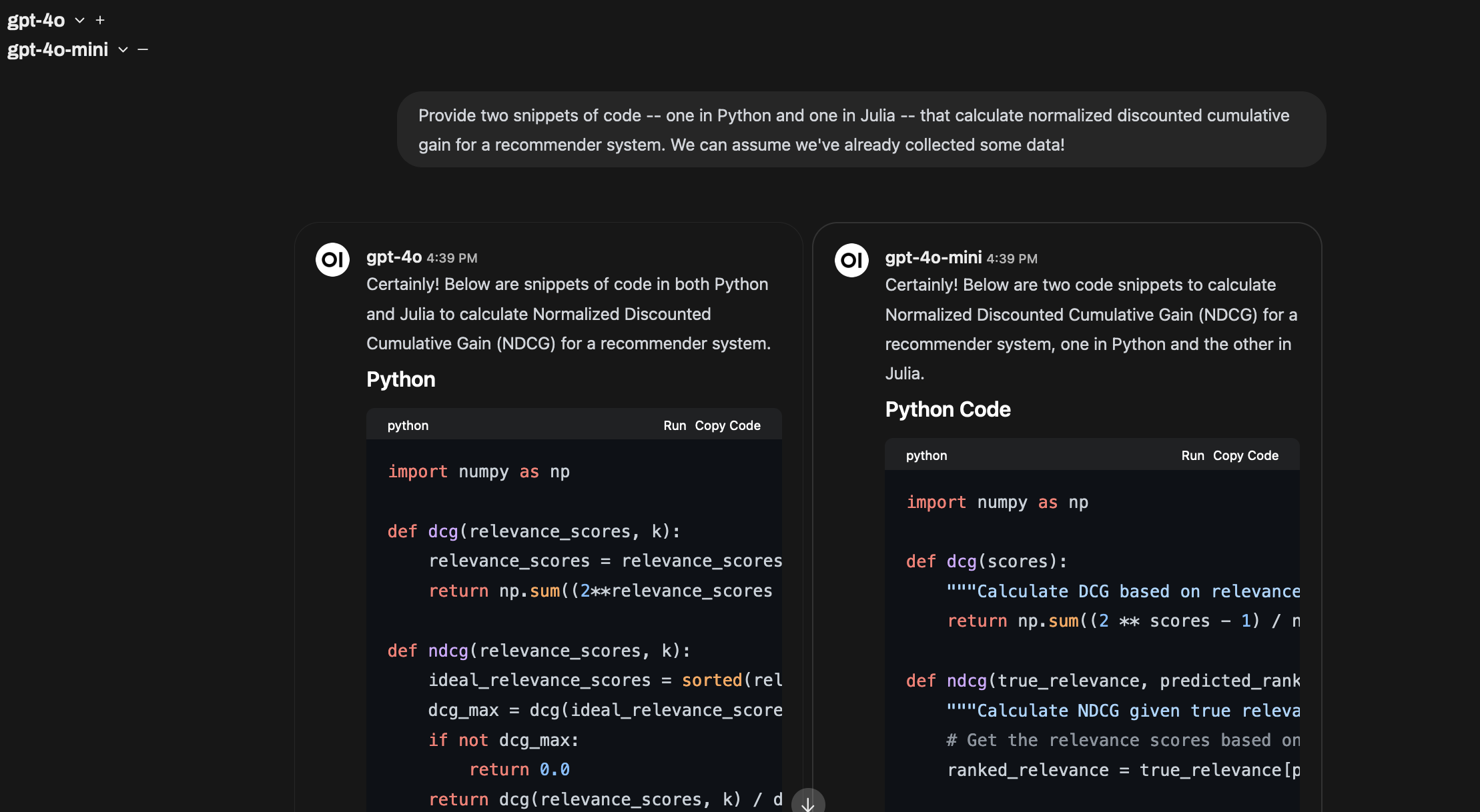 I believe the best way to interact with LLMs for many tasks will involve sending the same query to many models at once and viewing the results side-by-side (to start), and using more complex techniques to visualize the differences between responses. Perhaps these interfaces might highlight the “edit distance” between items, and drawing on my next point, looking to popular “diff” interfaces. Future interfaces could even go a step further and (1) allow users to “weave” together model interactions (efforts to make this easier are already underway) and (2) learn from user preferences over models.