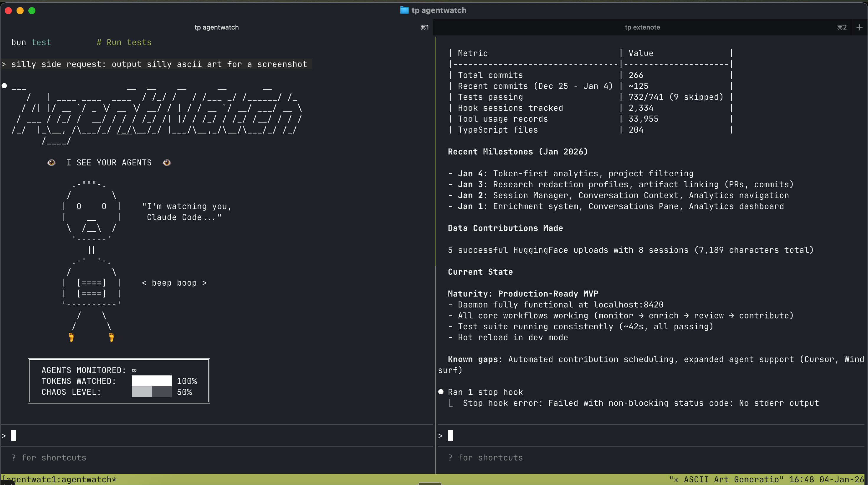 Agentwatch monitors running coding agents, collects additional data to link with agent transcripts, provides built-in tools for analyzing, annotating, and engaging with transcript data (which can be very useful even if you don’t care about data contribution or leverage), and provides a pipeline for users to sanitize and optionally contribute session data. The goal is to very concretely show what flywheel infrastructure might look like for agent traces: inspect what’s being generated, redact sensitive content, annotate with feedback, and decide whether to share.