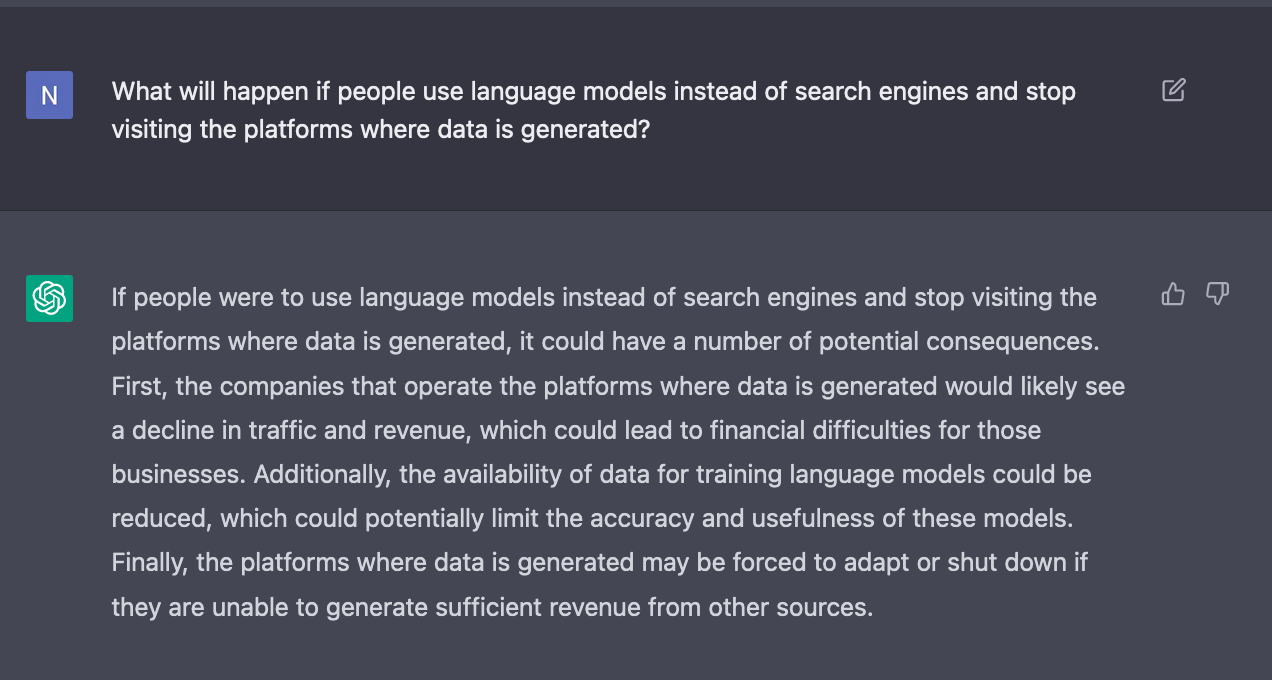 Without a doubt, these new systems are enormously exciting and potentially transformative. But there's a problem: if web users seriously shift their use of search engines to answer engines like ChatGPT, we're going to see the paradox of reuse return in an even more extreme form. Users will see fewer links, and the answers themselves will be downstream of content from even more platforms. It's not just Wikipedia that's powering these models (though Wikipedia certainly plays a disproportionate role); it's also StackExchange sites, Reddit communities, other forums, academic literature, and more. It's very important to the sustainability of platforms like StackExchange and Reddit that people actually visit the sites.
